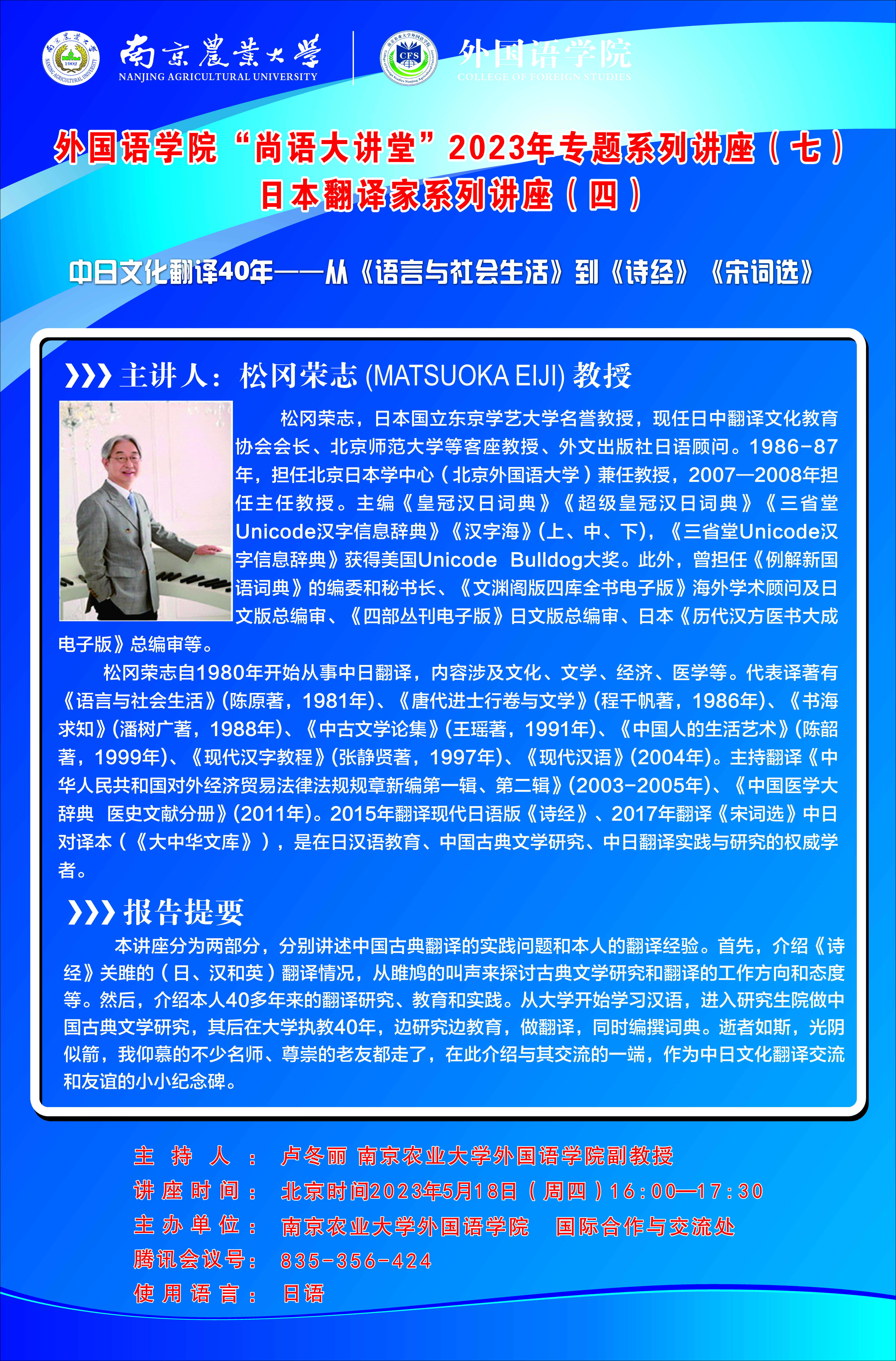 讲座题目:中日文化翻译40年——从《语言与社会生活》到《诗经》《宋词选》
